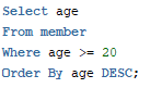 Oracle SQL Where문을 활용해 조건처리하기 * 조건처리 : Where * - SQL에는 파이썬처럼 if문, for문이 없음대신, Where문으로 조건처리를 할 수 있음. - Where 사용시 범위로 조건 지정은 불가(Between 사용해야함)(~이상, ~이하)* 오라클이 해석하는 순서 *1. select2. from 테이블3. where4. 컬럼들 (데이터에 저장되는 구간, 별칭 지정은 여기부터 가능)5. 정렬 order byselect from -- 조건이 있는 경우 where -- 정렬 오름 - ASC, 내림 - DESC order by; * 나이가 20살 이상인 모든 사람의 데이터를 조회하기 *-- 나이가 가장 높은 순서대로 정렬select agefrom memberwhere age >= 20Order By age DESC; 💾 디스켓에 저장 2023.07.12