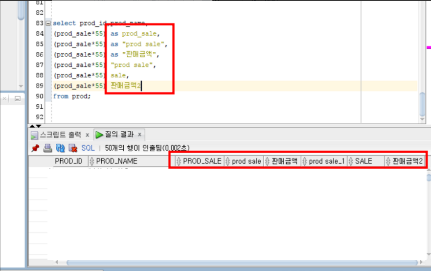 Oracle SQL 컬럼명 별칭(별명) 지정해주기 * 별칭(별명) : alias(as로 사용) *-- 별칭을 안써주면 ()안의 문자를 다 써야함 -- 순수하게 컬럼명만 사용하지 않고, -- 함수 또는 연산을 사용해서 조회하는 컬럼들은 -- 별칭(별명)을 사용해서 컬럼 이름을 지정해줌 -- as 사용하여 지정해줌 -- 별칭 사이에 공백이 있으면 쌍따옴표 사용 💾 디스켓에 저장 2023.07.12