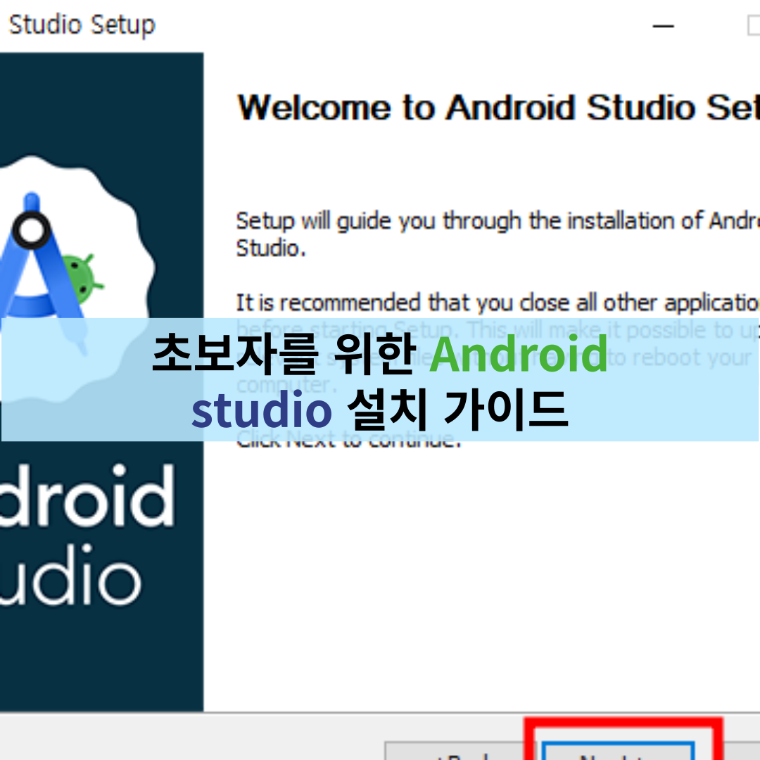 안녕하세요 이번 포스팅은 안드로이드 스튜디오 설치에 대해 알아보겠습니다. 안드로이드 스튜디오(Android studio)는Google이 공식적으로 지원하는 안드로이드 앱 개발을 위한 통합개발환경(IDE)입니다. 우선 안드로이드 스튜디오의 공식 홈페이지에서설치파일을 다운로드해줍니다.https://developer.android.com/studio?hl=ko 사용 약관에 동의 후 설치합니다. 설치 파일을 실행 후 Next 진행해 줍니다. Android Virtual Device는 개발하면서 진행 상황을볼 수 있는? 가상머신입니다.좋은 친구 특이점 없으니 Next Install 해줍니다. 설치가 완료되고 Android Studio setup Wizard가 실행될 텐데요설..